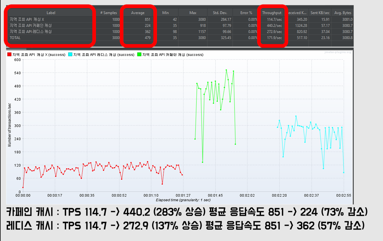 마지막으로 제가 프로젝트에서 로컬 캐시와 글로벌 캐시를 적용해서 성능 테스트를 한 결과를 보여드리고 글을 마무리하겠습니다.