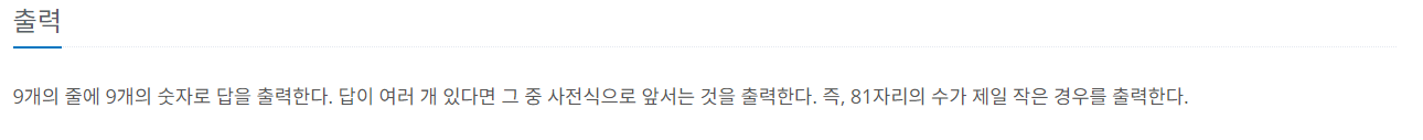 정리하자면 스도쿠의 조건을 만족시키는 사전순으로 가장 빠른 정답을 찾아내는 것이 문제에서 요구하는 것입니다.