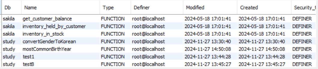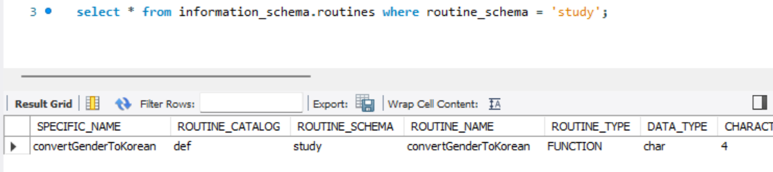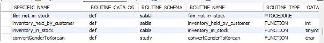 평소 다루던 테이블 형태로 저장되어 있기 때문에 조건문을 이용해 루틴의 타입이나 저장된 스키마만으로도 조회가 가능합니다. 아래 사진처럼 말이죠