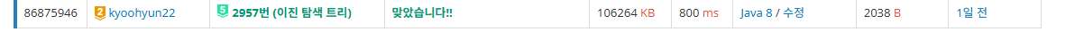 앞에서 말했던 것처럼, `TreeMap`을 이용했고, 각 노드에 대한 표현으로 dp를 위한 depth 변수, 그리고 left, right 자식이 있는지만을 체크해주기 위한 boolean 변수를 사용했습니다.