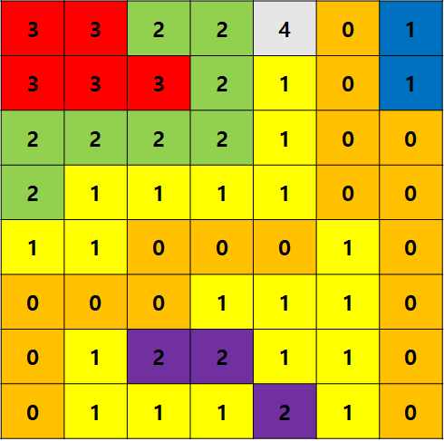 - '인접하다'는 X좌표의 차이, Y좌표의 차이가 모두 1이하일 때를 의미한다. 즉, 2차원 배열에서 기준점을 둘러싼 8방향의 지점을 의미한다.