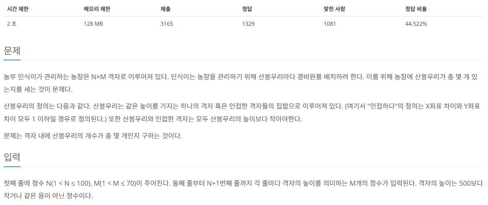 그래프 탐색을 익혀볼 수 있는 문제입니다. 그래프 탐색을 연습할 수 있는 대표적인 문제인 토마토이나 적록색약과 같은 느낌의 문제로 '산봉우리를 어떻게 계산할지'를 고민하면서 그 조건을 BFS 혹은 DFS에 접목시키는 것이 포인트입니다.